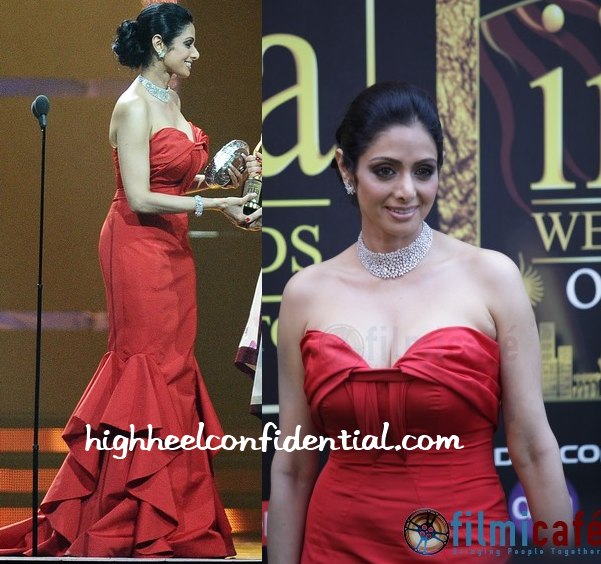 The gorgeous Sridevi went with a red strapless gown at the awards.