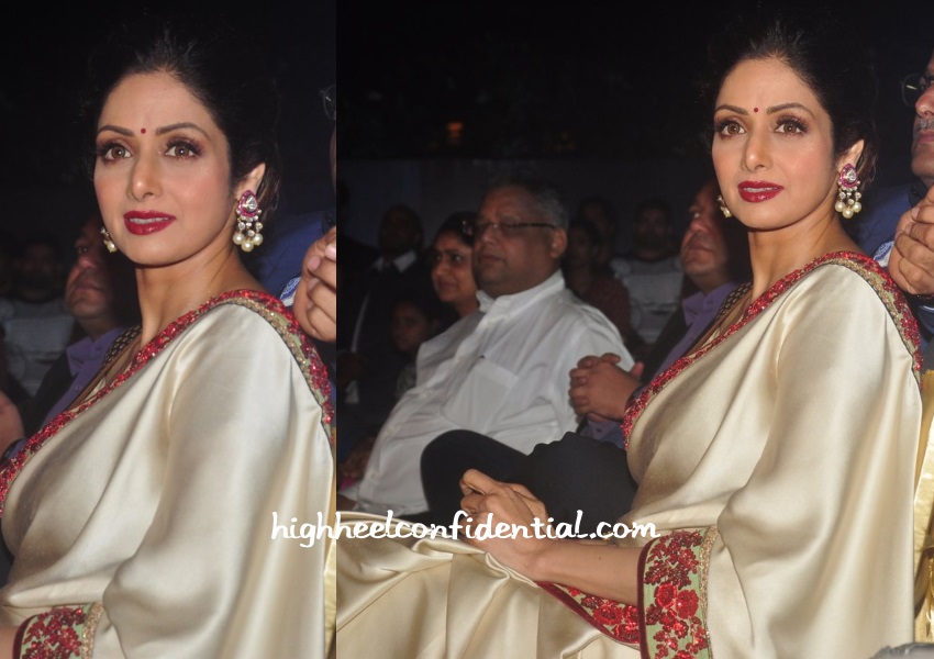 In her cream Sabyasachi sari, Sridevi looked regal at the music launch of Shamitabh. I have no complaints. Love!