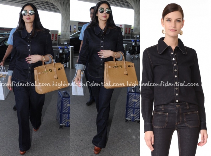 While leaving Mumbai a few days ago, Sridevi did denim on denim in Stella McCartney paired with her ostrich Birkin. Having seen the model’s tucked in styling, I would’ve liked to see Sridevi style hers the same way too.