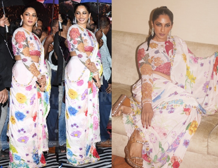 Sriya attended a pre-release event for her movie a few days back wearing an embroidered sari from Rahul Mishra with a rope braid and sparkly earrings. The sari was nice but that drape exposing the jarring white part on the side wasn’t a favorite. I also think the hairdo was too stark for the vibrant sari.