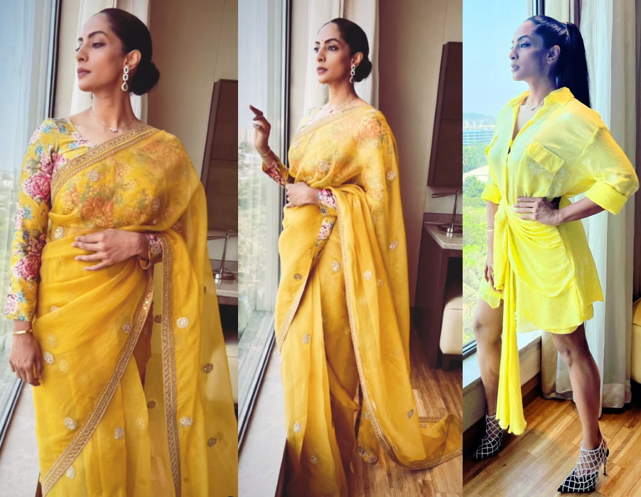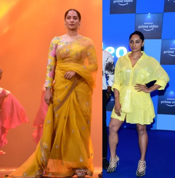 At the announcement of her OTT series, Sriya was seen wearing a Sabyasachi sari and then at the party hosted by streaming service, a yellow sequin dress paired with Jimmy Choo jewelled booties. She looked lovely in the sari. As for the dress, the long sash worn higher made the dress looked odd.