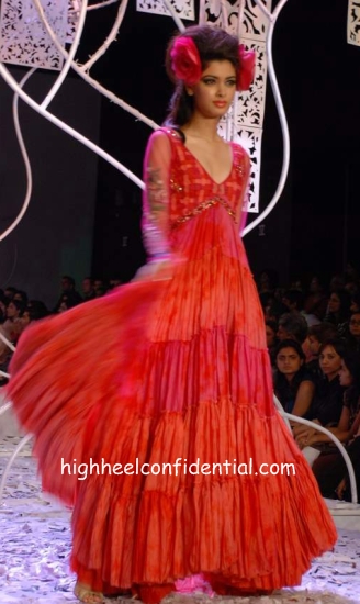 The editing scissors should have come out for this collection. There is just too much stuff going on. And don’t even get me started on the styling.Whoever ruined that pink dress by pairing it with those stockings and that 80s hairdo needs to be fired. The first outfit just looks sad. The print works well on the sari in the 2nd picture though. That gold churidar in the 6th picture is the biggest faux pas in a collection that has quite a few solid turkeys. What is UP with the sari in the 7th pic?? And those fugly papier mache roses in her hair??