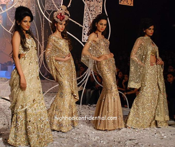 ewww! not liking any of the creations here – except for the last pic wid four models in it…i guess those 4 outfits make for good bridal wear…of course the guests wud all return home blind, having been bedazzled beyond tolerance. 😉