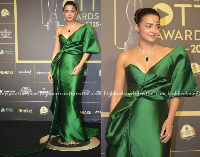 Surveen was seen at an awards event wearing a strapless emerald green gown from Pamela Usanto featuring a statement bow. Hair in a sleek updo, her look was finished out with a diamond and emerald drop necklace. Now, I didn’t particularly care for that single sticky strand but overall though this was quite a striking look.