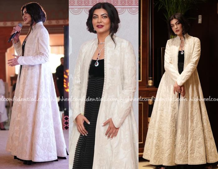 Sushmita attended the launch of a jewellery store in Doha and was seen wearing a floor length dress and jacket set from Rohit Bal paired with a necklace from the label. We normally see Ms. Sen with her hair down but off late have seen her try new things which is making for a very welcome change. (Thank you to whoever nudged her!)