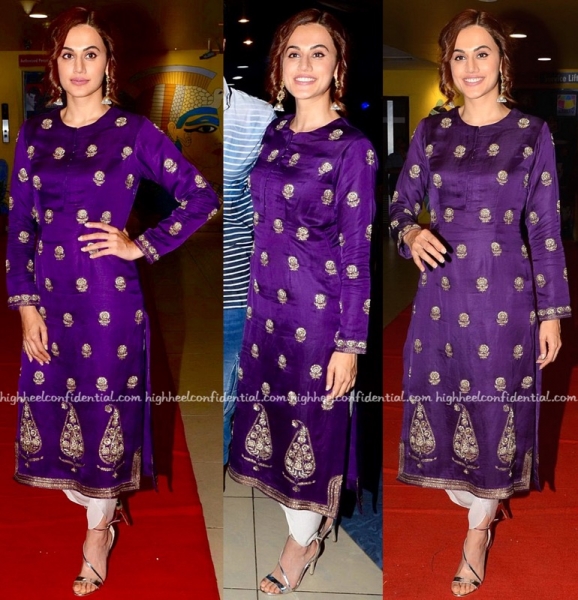 Wearing a Radhika Airi suit, Taapsee attended a screening of her movie. Big earrings and metallic sandals rounded out her look well; Taapsee looked nice. That said, am not the biggest fan of the two ringlets framing her face… Too dated and pageant-y. A wispier low knot would’ve been far more effective.