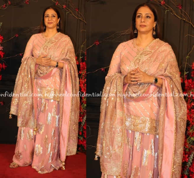 Tabu was seen at the Sinha-Iqbal reception in a pink sharara featuring gota work on the kurta and intricate embroidery on the dupatta. She looked lovely.