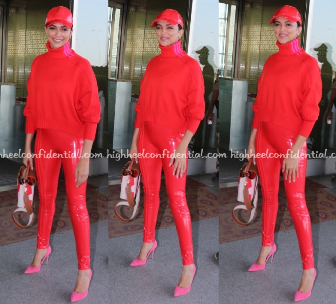 Wearing Adidas head to ankle, Deepika jetted out of Mumbai recently. Between those latex pants and the fact that she chose to wear a red cap to finish out this look, she had me seeing red! Her all-white look was so much more comfy and appropriate. Catch it inside.