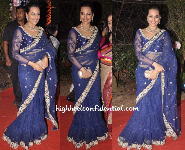 Sonakshi attended Ahana and Vaibhav’s wedding reception wearing a blue Ritu Kumar lehenga sari. The color looked great on her but I wasn’t a fan of the blouse. The white pattern against the blue felt too jarring.