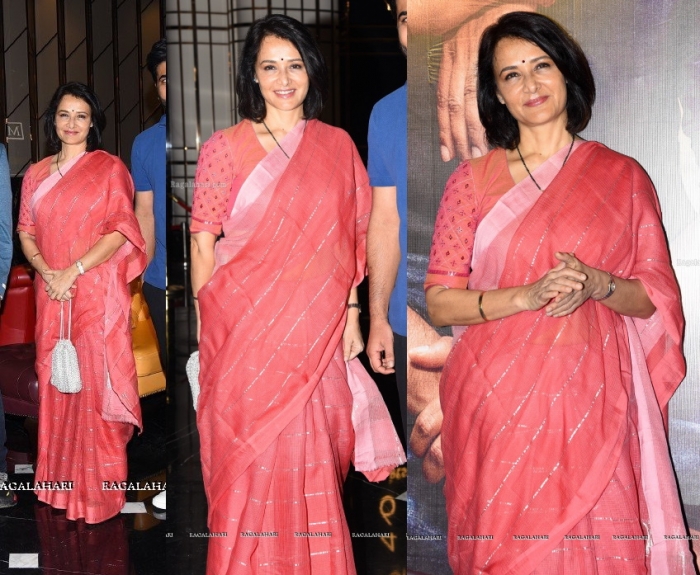 Amala attended the teaser launch of her upcoming movie wearing a salmon pink sari paired with a white potli. She looked charming.