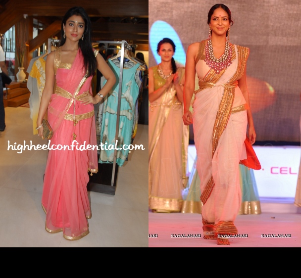 Amara just started stocking designs by Shilpa Reddy and in attendance was Ms. Saran wearing a pink belted sari by the designer. You’ll remember seeing a similar one in white on Lakshmi when she walked the ramp at the South Spin Awards.