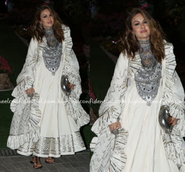 At the Ambani-Piramal Holi party, Natasha was seen in a full-length anarkali by Abu Jani Sandeep Khosla featuring a heavily embellished neckline. Instead of keeping it simple, Natasha added more silver necklaces to the neckline, bangles and a silver bag. The resulting high-neck effect felt suffocating to me. Not a fan. Did you like?