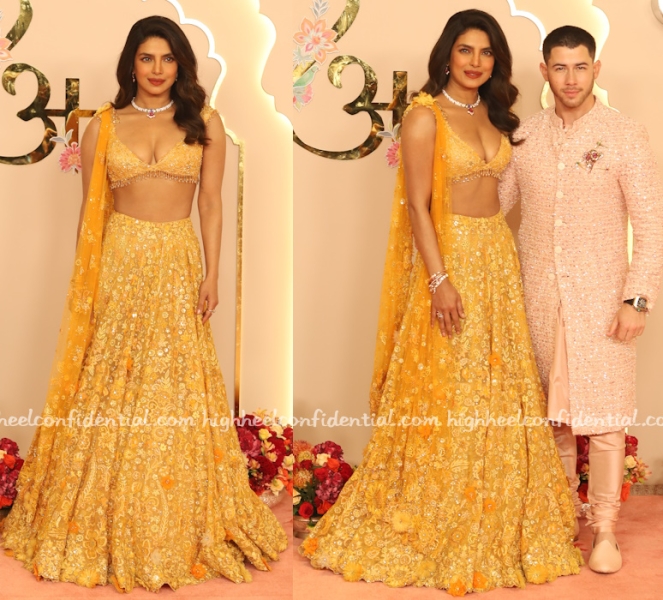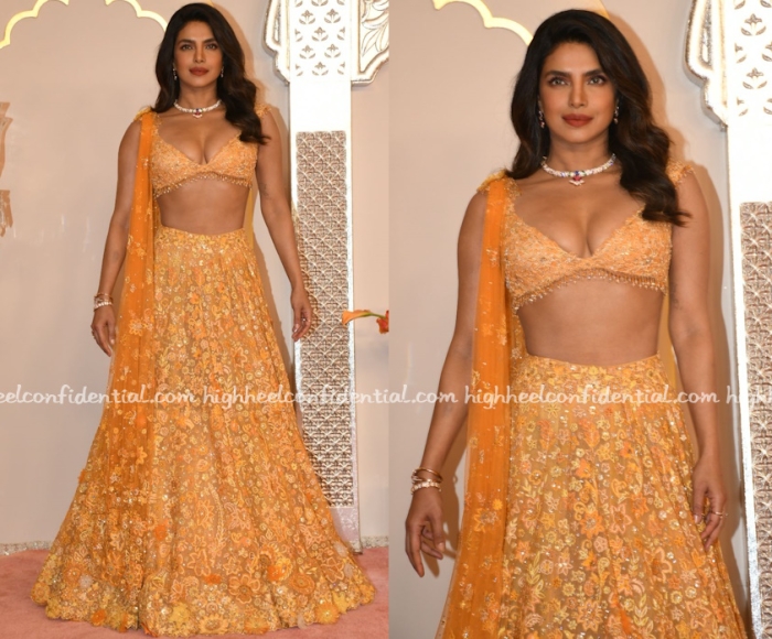 Priyanka was seen in an orange floral lehenga from Tarun Tahiliani paired with a Bvlgari necklace but of course at the baaraat ceremony. After seeing so much bling, this sure was different but the top was a bit too tight. Given there is so much dancing at a baaraat, am a bit nervous for her.