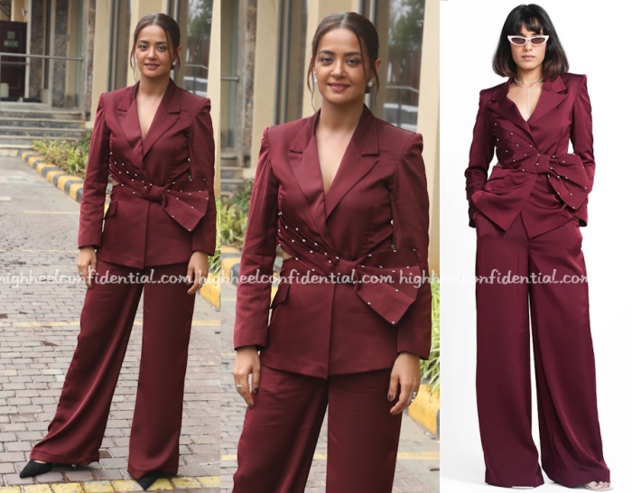 At promotions for her upcoming series, Surveen was seen in a maroon pantsuit from Ahi clothing. She looked nice in it but the more I look at the sleeves, the more evident the bad tailoring is.