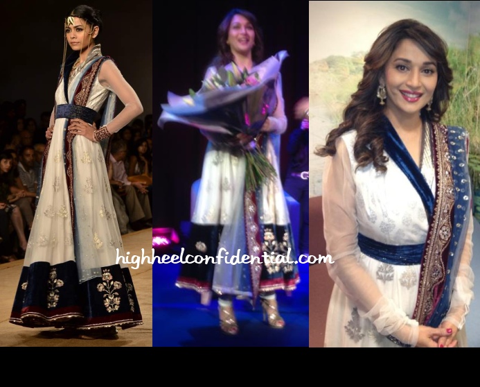 Wearing another Anju Modi couture outfit, this time a sari, Madhuri attended the Dinanath Mangeshkar Awards. Instead of the gun metal blouse, she opted for a blue 3/4 sleeve one.