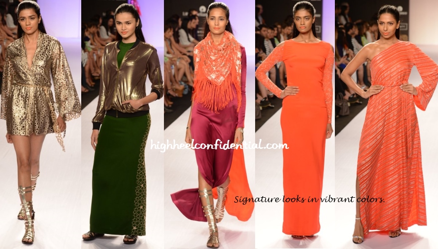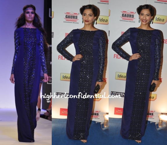 Richa shimmered in her Anushka Khanna suit while at a recent Awards night. Gold-tone accessories that included jewelry from Isharya, minaudière from Judith Leiber and strappy heels finished out her look. While she wears the look well, I wasn’t the biggest fan of the make-up. I understand the need for wanting to keep the make-up understated given the outfit, but truth be told, the bronzed look didn’t quite work. Would have rather seen her go retro with fresh faced make-up, kitten-eye and glossy lip. She’d have looked even better!
