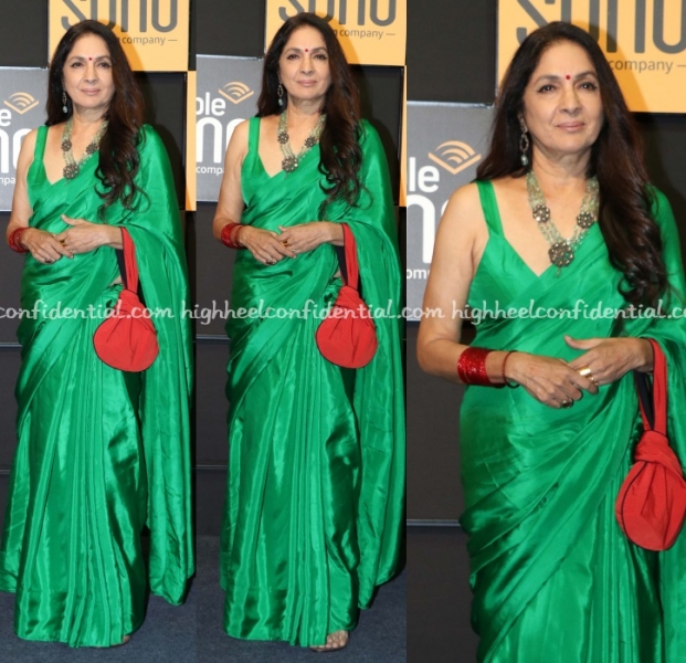 Neena attended the launch of an audio book app wearing an emerald green sari and matching blouse. As much as I have a weakness for this color, I really wish, she’d worn the sari with a green potli instead of the red one. It just felt too jarring against the delish green color.