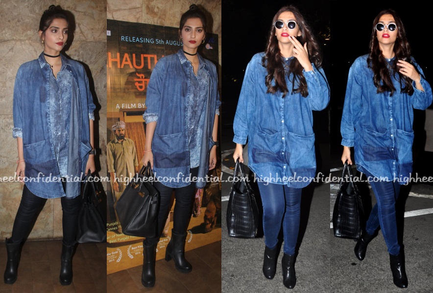 Sonam attended the screening of the Punjabi movie ‘Chauti Koot’ on Monday evening sporting denim on denim a bit differently. While we are used to seeing denim shirts over denim pants, the actor wore her oversized Bhane denim shirt over another denim one!