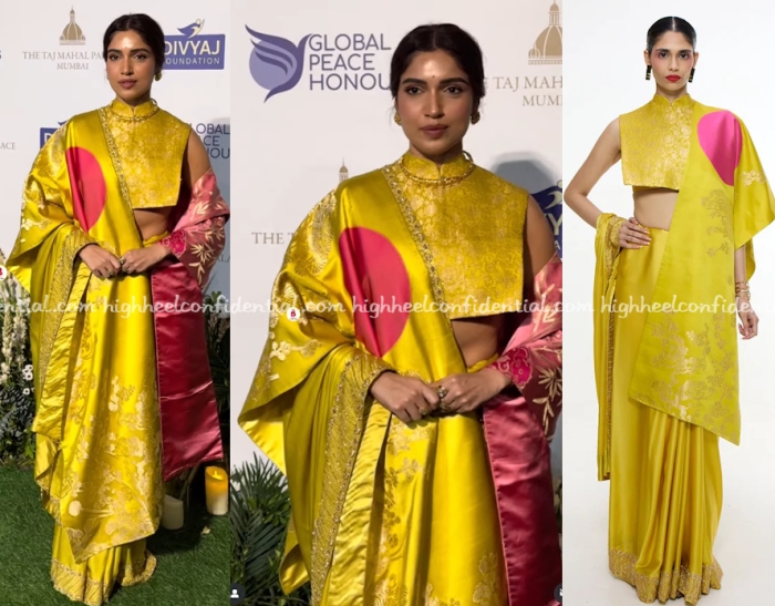 Bhumi attended a panel session in Singapore and was seen wearing a Rohit Bal structured jacket and lehenga set to the event. Now, while she took pictures wearing the topi (head cap) and some with the earring extensions, the actual event saw her skip both which made for a good move.