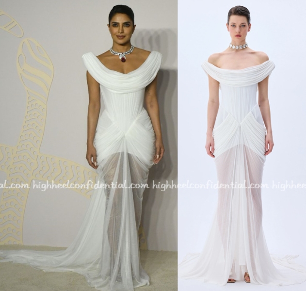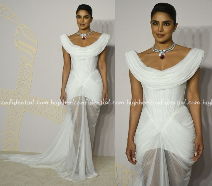 Priyanka attended the opening night of the Bvlgari exhibition wearing an off-shoulder gown from Raisa Vanessa paired with a neckpiece from Bvlgari, but of course. I don’t like the sheer skirt as much but waist up, she looked good.