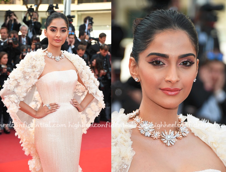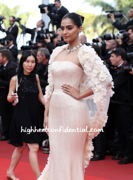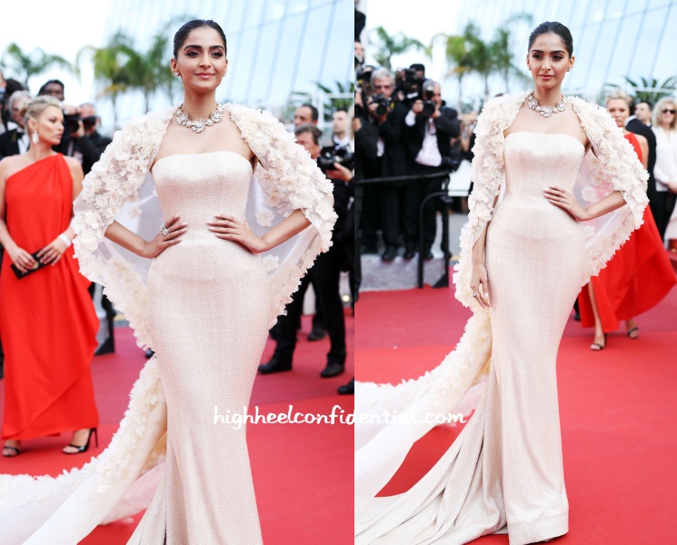 Sonam’s second appearance at Cannes was in another light-colored gown, this one also by Ralph & Russo, this one also featuring a cape that had a long train.