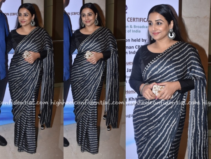 Vidya attended an event on Saturday wearing a printed black sari by Punit Balana with earrings from Sangeeta Boochra. Love the sari and the earrings. The middle-parted hair though, not so much.