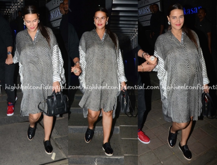 Neha caught dinner with Angad on Saturday evening and was seen wearing a printed Punit Balana shirt dress paired with her Stella McCartney sneakers and Céline Nano bag.