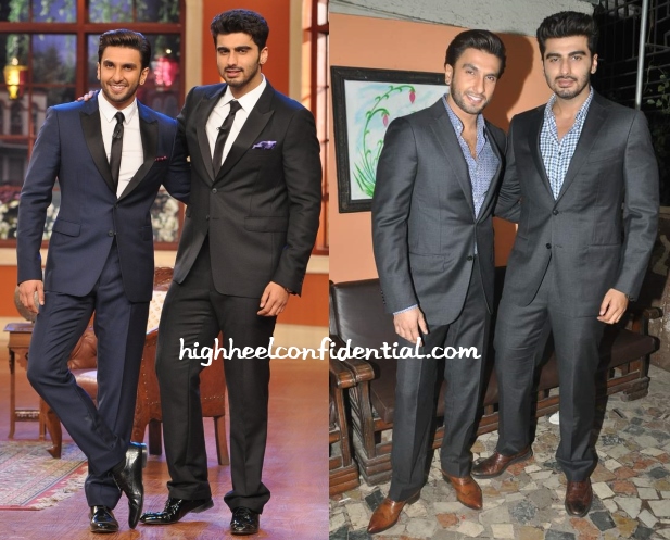 Ranveer and Arjun visited two comedy shows back to back first in black Burberry suits and then in grey Zegna ones with Ranveer in a Missoni shirt and Arjun in a Zara one.