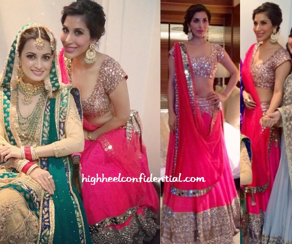 Sophie, who attended the Dia-Sahil wedding, posted pics of herself from the event on her Instagram profile allowing us a peek into her look. For the wedding and reception, Ms. Choudry wore a pink mirrorwork Manish Malhotra lehenga with chand baali earrings.