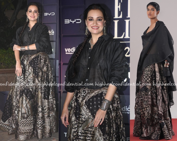 Dia opted to wear a black shirt and brocade lehenga style skirt set from Urvashi Kaur to an event on Tuesday evening pairing it with a braid and silver jewellery. She looked nice in it.
