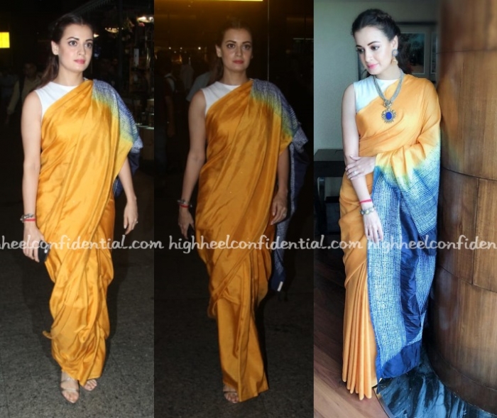 For a recent appearance of hers, Dia kept things simple in denims and a Saaksha and Kinni shirt. Wavy hair and pair of orange-toned wedges rounded out her look.