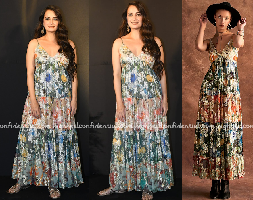 Dia stopped by at a birthday party hosted at a local eatery wearing a lurex maxi dress from Verb By Pallavi Singhee paired with gladiator flat sandals and gold earrings. Like the maxi?