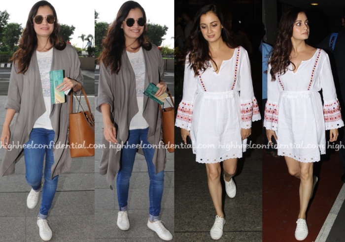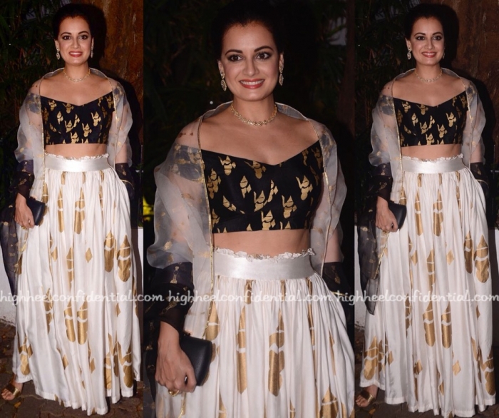 At the launch party of a perfume on Wednesday evening, Dia was seen wearing a black Adarsh Gill dress with D’Orsay heels and a bold red lip.