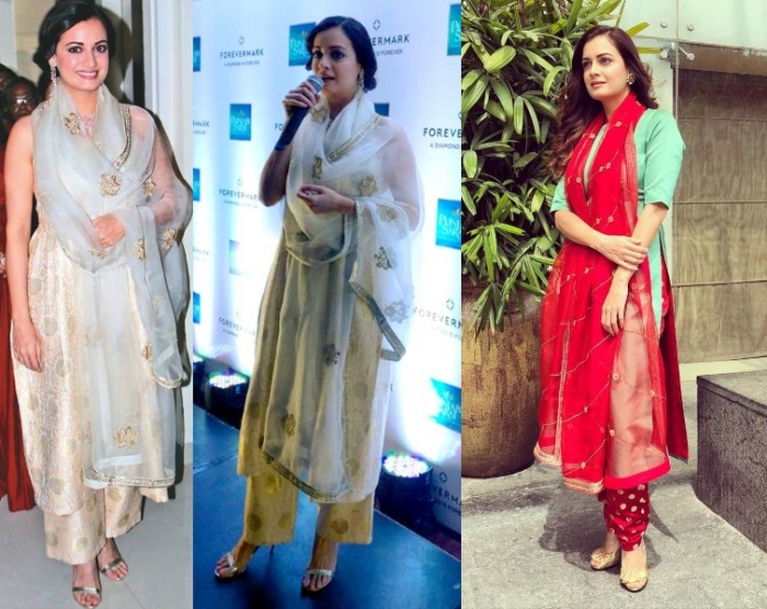 At two appearances recently, Dia was seen in Raw Mango suits, first in a cream brocade one at the launch of a jewellery collection in Indore and then in a green and red at a environment fest in Bangalore.