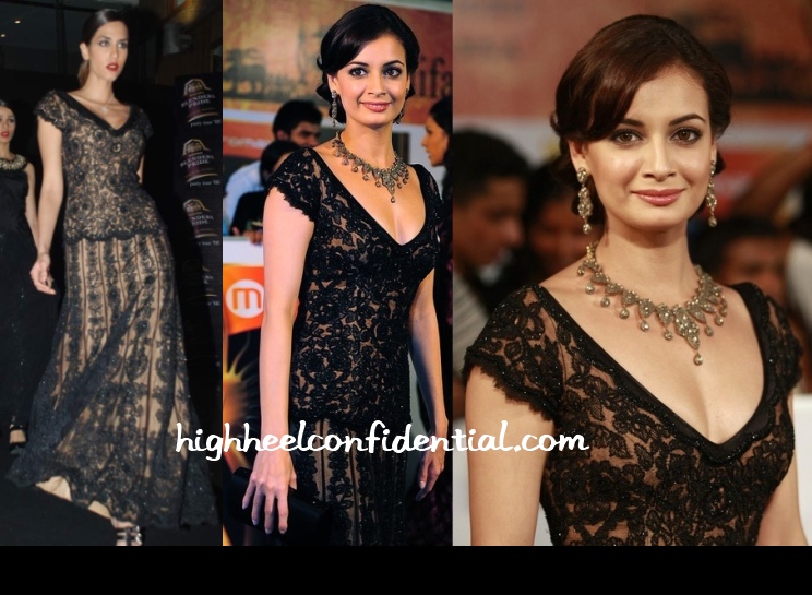 It was a Rocky S gown for Dia Mirza at the IIFA Awards green carpet. I have odd feelings about this gown because it feels like a lehenga-choli stitched together (kinda like a ready-made-stitched-sari). On Dia, I like that she pulled the hair back to match the old-school vibe that the gown has but the jewels don’t quite gel with it.