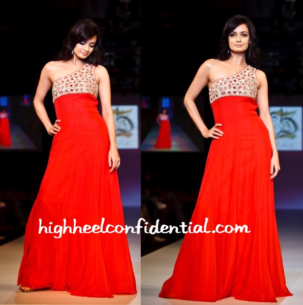 At the recently held Dubai Fashion Week, Dia Mirza walked for designer Zaeem Jamal’s label ‘Z For Z’ in a red one-shouldered gown. I like that even with all that red and the lattice bust detail, Dia still manages to make the gown look so graceful. On anyone else, this gown would probably look garish. You like?
