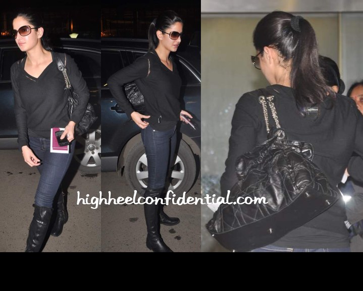 Spotted Ms. Kaif leaving Mumbai in a predominantly black outfit and a Dior Le Trente bag. I may not be a big fan of this particular Dior but gotta say Kat looks great in her outfit. (But then, I do have a weakness for riding-style boots. 😛 )