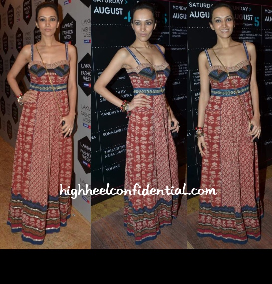 Having seen the runway pic where the green jumpsuit was paired with the red clutch, am not quite on board with Dipannita’s choice of opting for the grey clutch and black pumps. Made the look dull.