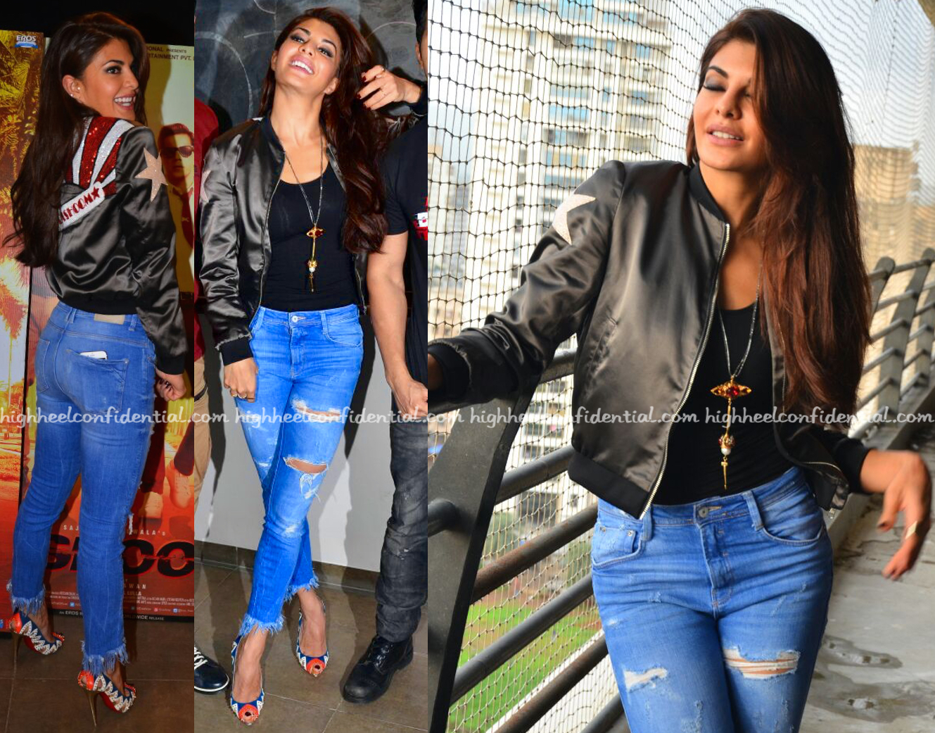For latest round of movie promotions, Jacqueline put in an appearance in a custom leather bomber and distressed Zara denims. A gold-tone necklace and pair of sky-high Louboutins rounded out the look. Nothing to fault here; she looked good! And boy do we have a major case of shoe envy!