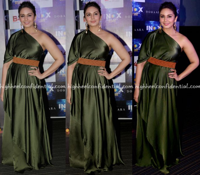 While at an event promoting her upcoming movie, Huma was photographed in a Deme by Gabriella dress. With a tan belt cinching in the waist, the actor rounded out the look with gold-toned jewelry. Like the look on her?