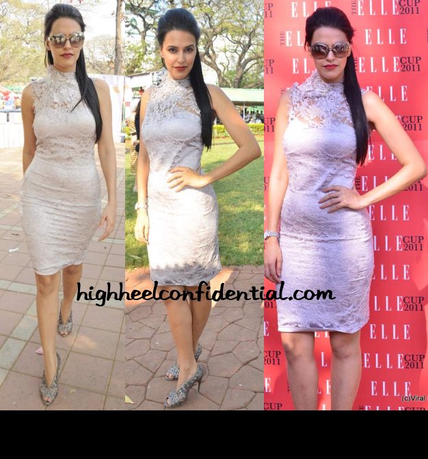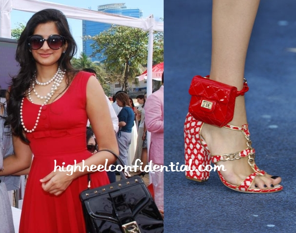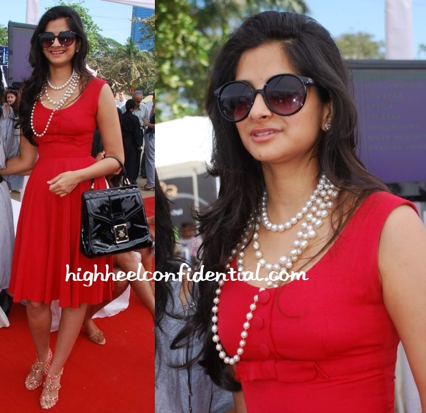At the races, Rhea Kapoor channels a bit of Chanel not by donning black and white but by wearing multi-stranded pearls with a red dress and a black patent frame bag. Red Chanel sandals complete her look. For a day event, the red dress with the pearls is a bit overwhelming to me but it’s a cute look. You like?