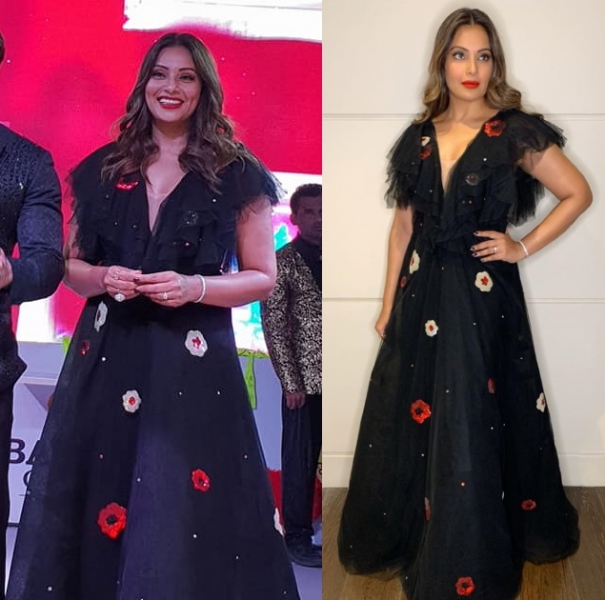 Back in March when promoting her web series, Karisma was photographed in Saaksha and Kinni separates at one event, and in a Three Floor dress at another. Karisma makes almost everything she picks work for her and this was no exception, she wore both looks well. If I had to pick though, my vote would go to the Saaksha and Kinni; both the silhouette and color worked great on her.
