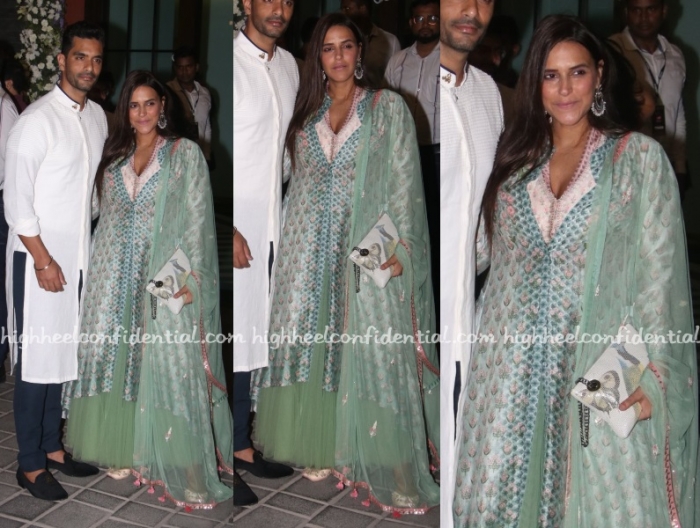 At Arpita and Aayush’s Ganesh Chaturthi celebrations, Neha was seen in an Anita Dongre printed and tulle long kurta paired with silver and pearl chand-baalis, Needle Dust jootis and a bird print clutch.