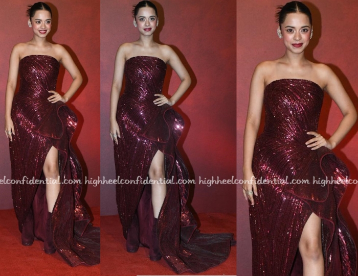 Nitanshi wore strapless wine-colored gown from Gaurav Gupta with a sleek updo, ear cuffs and a lip shade that matched the gown. My very minor gripe here is the matching boots, more so the height of the boots being at the calf which was throwing off proportions. Overall, she looked good! No denying that.
