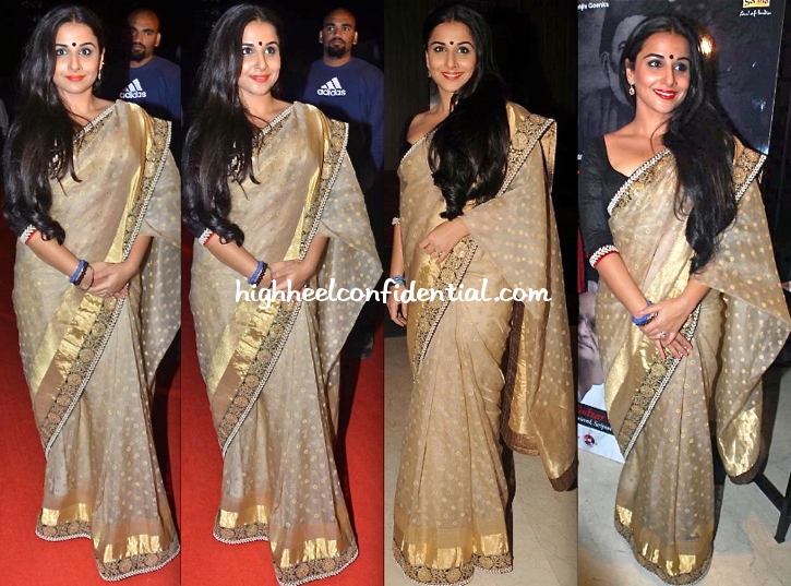 It was a busy night for Ms. Balan attending two back-to-back events! Minus whatever was going on with the hair, she looked great in her organza Sabyasachi sari!