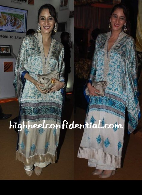 Reshma Bombaywala wore a Shahab Durazi dress to the designer’s show at the Couture Week. Can’t help but think her signature red lips, the matchey eye shadow and the hair were a tad too harsh for the icy tones of the dress. Not that the dress in itself had much going for it.