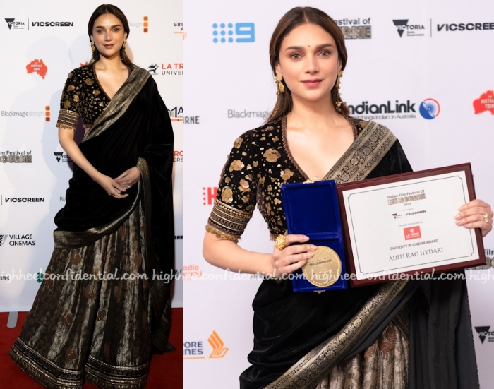 Aditi attended the awards night of IFF Melbourne wearing a lehenga from Raw Mango in a Pavadai Thavani drape, one that also is quite her signature. No complaints though. She looked lovely in it.