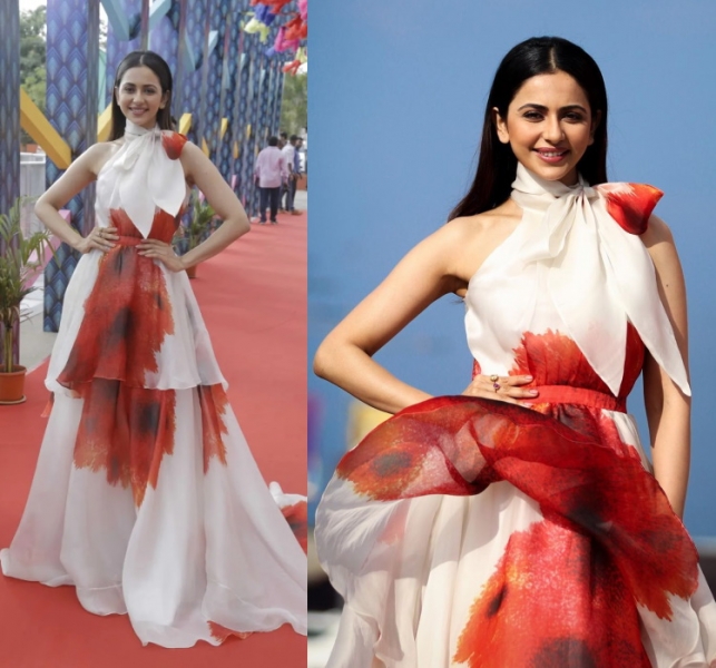 Rakul attended the IFFI closing ceremony back in November wearing a tiered gown by Gauri and Nainika. She looked nice but having said that, didn’t quite care for that single tier.