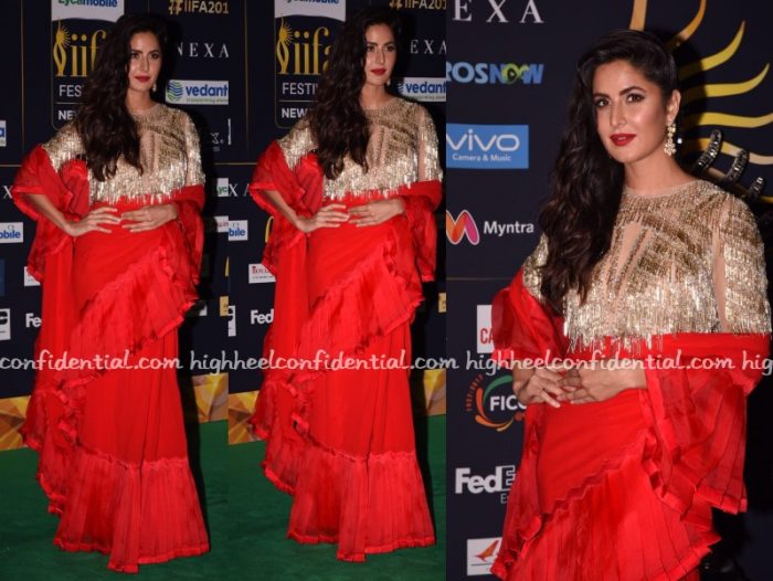 Like Katrina, Taapsee served up a whole lot of red in her Kommal Sood gown at IIFA Rocks. Wearing her hair up, she finished out the look with flowers in her hair, a matching red lip, big earrings, cocktail ring and a bindi.