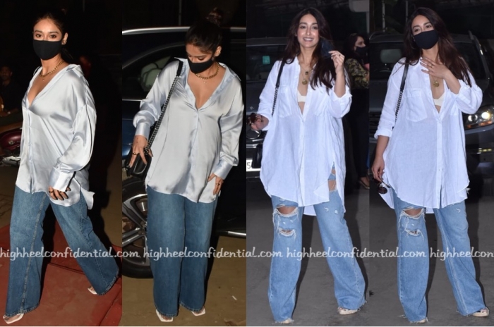 While out and about in Mumbai recently, Ileana picked distressed denim to wear- first teaming her activewear with a denim jacket and later, teaming the wide-legged pants with a crop-top and tie-dye jacket. Trusty white sneakers and black chain-strap bags rounded out both looks. Which do you like her more in?